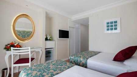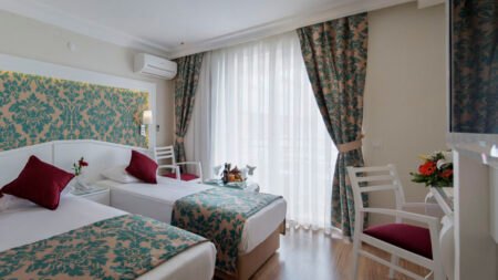 Winter Wanneer je tussen 01-11-2025 en 31-03-2026 in deze accommodatie verblijft, is onderstaande informatie van toepassing. * Ligging * Openbaar strand Kleopatra Strand op circa 100 meter * Alanya op circa 2 kilometer * Algemeen & faciliteiten * 1 gebouw * Maximaal 5 verdiepingen * 107 kamers * Receptie * 24 uur per dag * Lobby met zitgedeelte * 2 liften * Wifi in alle openbare ruimtes * Internetruimte * Winkel * Wasservice tegen betaling * Doktersservice tegen betaling * Restaurants & bars * Buffetrestaurant * Roomservice tegen betaling * 3 drinkgelegenheden * 3 bars * Activiteiten & ontspanning * Fitness * Spa Center * Binnenzwembad * Sauna tegen betaling * Turks stoombad tegen betaling * Bubbelbad binnen * Massages tegen betaling * Schoonheidsbehandelingen tegen betaling * Animatie * Eén keer per week * Zwembaden * Buitenzwembad * Buitenzwembad voor kinderen * Zonneterras * Ligbedden * Parasol * Badhanddoekenservice tegen betaling * Verzorging * Halfpension * Ontbijt in buffetvorm * Diner in buffetvorm * All Inclusive * Ontbijt in buffetvorm (07.00-10.00 uur) * Laat ontbijt in buffetvorm (10.00-10.30 uur) * Lunch in buffetvorm (12.30-14.00 uur) * Diner in buffetvorm (19.00-21.00 uur) * Koffie, thee & koekjes (17.00-18.00 uur) * Selectie lokale (non-)alcoholische drankjes (10.00-23.00 uur) * Tegen betaling: roomserviceHotelkamers * 2-persoonskamer Voordeel DE * 2-persoonskamer Standaard DZ * Airconditioning * Kluisje tegen betaling * Satelliettelevisie * Telefoon tegen betaling * Badkamer douche, toilet en föhn * Wifi * Balkon (zitje)