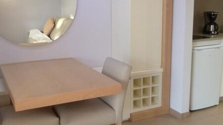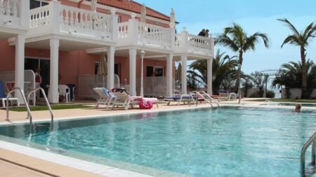 De roze laagbouw appartementen bieden een gezellige uitstraling. Het heerlijke zwembad is direct voor de appartementen te vinden en daarom kun je ’s ochtends gelijk een verfrissende duik in het zwembad nemen. Om het zwembad liggen genoeg comfortabele ligbedjes waar je heerlijk van de zon kunt genieten. De appartementen zijn modern ingericht en voorzien van alle nodige gemakken.