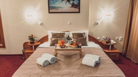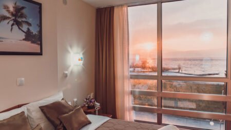 Hotel Aqualina ligt te midden van een rustige en groene omgeving, direct aan de oever van het betoverende Meer van Ohrid. Aan de ene zijde omringd door het heldere water van het meer, aan de andere zijde door het weidse groen van het nationale park Galicica. Het bruisende centrum van Ohrid-Stad bevindt zich op slechts zes kilometer afstand en is gemakkelijk bereikbaar met het openbaar vervoer als per taxi. Het hotel beschikt over een prachtig zwembad dat een panoramisch uitzicht biedt op het meer. Voor de jongere gasten zijn er twee zwembaden, waaronder een zwembad met speeltoestellen en glijbaantjes. Sportliefhebbers vermaken zich met activiteiten zoals tennis en voetbal. In het restaurant kun je terecht voor alle maaltijden. Hotel Aqualina biedt een perfecte mix van rust en vermaak aan het Meer van Ohrid.