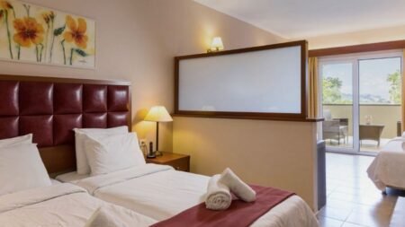 Zomer Wanneer je tussen 22-04-2025 en 30-10-2025 in deze accommodatie verblijft, is onderstaande informatie van toepassing. * Ligging * Openbaar strand op circa 600 meter * Dichtstbijzijnde winkel op circa 600 meter * Dichtstbijzijnde restaurant op circa 600 meter * Dichtstbijzijnde bar op circa 600 meter * Corfu-Stad op circa 3 kilometer * Bushalte * Algemeen & faciliteiten * 1 gebouw * Maximaal 6 verdiepingen * 156 kamers * Receptie * 24 uur per dag * 3 liften * Bagageruimte * Wifi in alle openbare ruimtes * Wasservice tegen betaling * Doktersservice tegen betaling * Tuin * Privé parkeergelegenheid * Restaurants & bars * Buffetrestaurant * 2 drinkgelegenheden * 2 bars * Activiteiten & ontspanning * Biljart tegen betaling * Tafelvoetbal tegen betaling * Spafaciliteiten * Massages tegen betaling * Schoonheidsbehandelingen tegen betaling * Zwembaden * Buitenzwembad * Buitenzwembad voor kinderen * Zonneterras * Ligbedden met matrasjes * Parasol * Badhanddoekenservice tegen betaling en met borg * Verzorging * Logies & Ontbijt * Ontbijt in buffetvorm * Halfpension * Ontbijt in buffetvorm * Diner in buffetvorm * All Inclusive * Ontbijt in buffetvorm (07.00-10.15 uur) * Lunch in buffetvorm (12.30-14.30 uur) * Diner in buffetvorm (19.00-21.30 uur) * Snacks (16.00-17.00 uur) * Koffie, thee & koekjes (16.00-17.00 uur) * IJs (12.30-14.30 and 19.00-21.30) * Selectie lokale (non-)alcoholische drankjes (08.00-00.00 uur) * Niet inbegrepen: * Geïmporteerde drankjesHotelkamers * 2-persoonskamer Standaard Landzicht DZL * Oppervlakte van circa 24 m² * Landzicht * Airconditioning * Televisie * Telefoon tegen betaling * Eet- en drinkfaciliteiten * Mini koelkast * Badkamer douche in bad, toilet en föhn * Balkon of terras (zitje) * 2-persoonskamer Standaard Meerzicht DZK * Oppervlakte van circa 24 m² * Meerzicht * Airconditioning * Televisie * Telefoon tegen betaling * Eet- en drinkfaciliteiten * Mini koelkast * Badkamer douche in bad, toilet en föhn * Balkon of terras (zitje) * Familiekamer Standaard Zwembadzicht FZP * Oppervlakte van circa 32 m² * Zwembadzicht * Airconditioning * Televisie * Telefoon tegen betaling * Eet- en drinkfaciliteiten * Mini koelkast * Badkamer douche in bad, toilet en föhn * Balkon of terras (zitje)