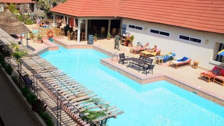 Knus hotel met fijn zwembad, Op vijf minuten van het strand, Restaurants en bars om de hoek, Gelegen in het gezellige Kololi, Met drankje relaxen aan zwembad, Geniet van de Gambiaanse zon & inclusief transfers.