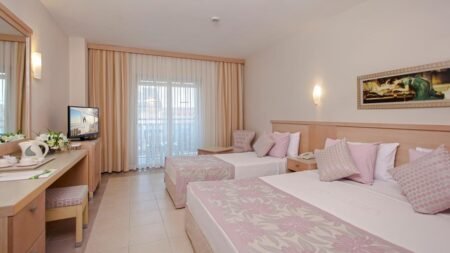 Je rijdt Manavgat binnen en stapt direct een tropisch resort binnen. Palmbomen, kleurrijke tuinen en lichte gebouwen vormen samen een relaxed dorp met een fris en gezellig uiterlijk. Het zwembad nodigt uit voor verkoeling en overal vind je knusse hoekjes voor een koud drankje. Het restaurant en de poolbar zijn vormgegeven als een elegant schip met houten dek en witte zeilen. Het strand ligt op een kleine kilometer afstand, waar een shuttle je zo naartoe brengt. Ook voor eten zit je goed van buffet tot snacks en à la cartegerechten. 's Avonds zorgen shows, muziek en drankjes aan de bar voor de perfecte vakantiesfeer.
