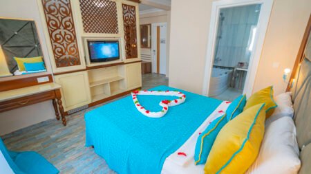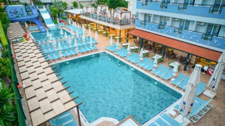 Club Big Blue Suite Hotel ligt in de rustige wijk Oba en aan de rand van het centrum van Alanya. Het privéstrand vind je op loopafstand net als vele winkels, restaurants en bars. Het centrum van Oba bestaat voornamelijk uit laagbouw met een gezellig centrum met mooi geplaveide winkelstraten vol leuke winkeltjes en eetgelegenheden. Het familiehotel Club Big Blue Suite Hotel beschikt over twee zwembaden, waaronder een zwembad met glijbanen. In het buffetrestaurant kun je genieten van heerlijke maaltijden. Sport en ontspanning mogen tijdens je vakantie natuurlijk ook niet ontbreken. Zo kun je bijvoorbeeld een potje tafeltennissen of beachvolleyballen en in de sauna of tijdens een massage kun je heerlijk ontspannen. De kids zullen zich hier zeker ook vermaken. Zo is er een kinderbad, een miniclub en een speeltuin. Kortom, dit familiecomplex is ideaal voor jong en oud!
