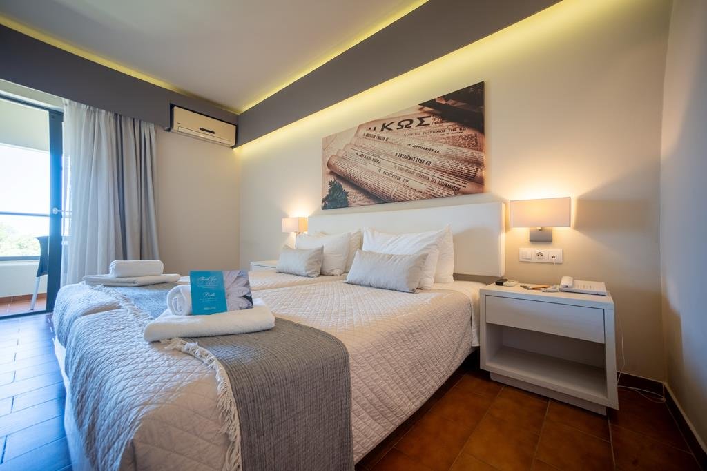 Supervriendelijk personeel, Kleinschalig complex, Net buiten Kos-stad, In een paar stappen op het strand, Heerlijk dobberen in het zwembad, Moderne, nette kamers & inclusief transfers.