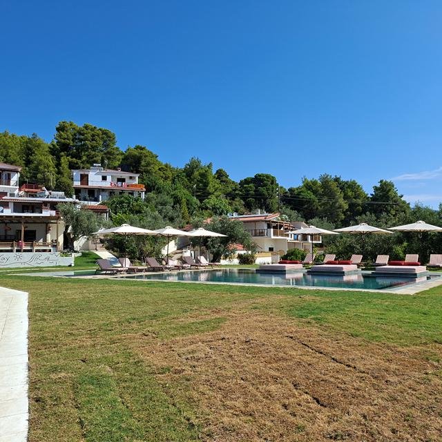 Net onder het hotel ligt het fijne zandstrand, dat uitnodigt om af te koelen en te genieten van een dagje strand. Het zwembad van het hotel ligt op de eerste verdieping met uitzicht op zee. Het zwembad wordt omringd door een weelderig gazon met comfortabele ligstoelen. Perfect om lekker te ontspannen. Neem af en toe een verfrissende duik en bestel een ijskoude frappé en geniet van je welverdiende vakantie.