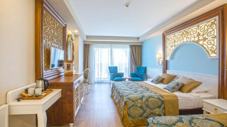 Welkom bij J'adore Deluxe Hotel & Spa, een aangenaam toevluchtsoord in de kleine toeristische badplaats Titreyengol. Dit comfortabele hotel ligt aan de prachtige kustlijn en bevindt zich op slechts 5 kilometer afstand van het levendige Manavgat. Met twee verfrissende buitenzwembaden en een spectaculair aquapark met leuke glijbanen is J'adore Deluxe Hotel & Spa de perfecte uitvalsbasis. In het hart van het resort vind je maar liefst zeven verschillende restaurants, waar je kunt genieten van voortreffelijke gerechten. Na een dag vol activiteiten kun je ontspannen in één van de vier gezellige bars en genieten van je favoriete drankje. Voor wie volledig wil ontspannen, beschikt het hotel over een uitgebreide spa met diverse behandelingen en massages om de dagelijkse stress te verlichten. Hier kun je echt tot rust komen tijdens je welverdiende vakantie! Geniet van de prachtige omgeving en alle gemakken die het J'adore Deluxe Hotel & Spa te bieden heeft voor een geslaagde vakantie. Tijdens je verblijf kun je ervoor kiezen om het excursiepakket met drie excursies te boeken. Met dit pakket maak je een boottocht over de rivier de Manavgat en kun je volledig tot rust komen in de hamam. Wil je een adrenalinekick ervaren? Met de Jeep & Raft excursie doorkruis je met de jeep het indrukwekkende Taurusgebergte en sluit je de excursie af met een spannende rafttocht.