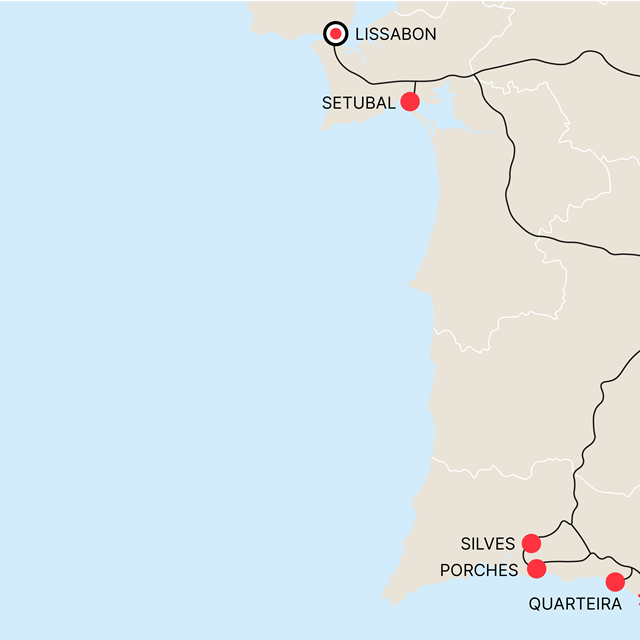 Na het ontbijt rijd je in de richting van Porches om het beroemde “Porches Pottery” te bezoeken. Hierna ga je naar het kasteel van Paderne, waarna je luncht in het kleine dorpje. Na de lunch pak je de reis weer op naar Loulé om het bekende “Mercado de Loulé” te zien. Later op de middag rijd je in de richting van Quarteira, maar stop eerst nog even in Almancil voor de kerk van São Lourenço.