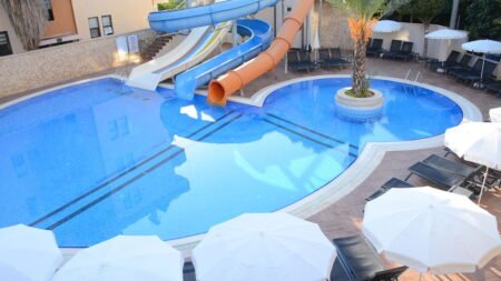 Direct naar: * Ligging () * Faciliteiten () * Restaurants & Bars () * Hotelkamers () * Sport & Ontspanning () * Kinderfaciliteiten () * Zwembaden & Strand () * Verzorging () Ligging: Almera Park * Ca. 350 meter van het strand * Ca. 2 kilometer van Alanya-Centrum * Bushalte op ca. 300 meter * Winkels op ca. 300 meter * Restaurants en bars op ca. 500 meter Faciliteiten * 1 hoofdgebouw en 1 bijgebouw met maximaal 8 verdiepingen * In elk gebouw is een lift aanwezig * 87 appartementen * 24-uursreceptie * Bagageruimte * Lobby * Tuin * Wifi in de openbare ruimtes * Roomservice* * Kapsalon* * Minimarkt* * Doktersservice* op aanvraag * Openbare parkeergelegenheid *Tegen betaling Restaurants & bars * 1 restaurant * 1 bar * Tegen betaling Hotelkamers * 2-kamerappartement annex (2-4 personen) * Gelegen in het bijgebouw * Ca. 35-40 m² * Bestaat uit een woon-/slaapkamer met slaapbank en een aparte slaapkamer * Telefoon* * Airconditioning* * Televisie * Kluisje* * Wifi * Kitchenette * Koelkast * Koffie-/theezetfaciliteiten * 2-pitskookplaat * Inloopdouche * Toilet * Föhn * Balkon of terras met zitje *Tegen betaling * 2-kamerappartement (1-4 personen) * Ca. 40-45 m² * Gelegen in het hoofdgebouw * Bestaat uit een woon-slaapkamer met slaapbank en een aparte slaapkamer * Dezelfde faciliteiten als het 2-kamerappartement annex * 2-kamerappartement comfort (2-5 personen) * Ca. 40-45 m² * Gelegen in het hoofdgebouw * Bestaat uit een woon-slaapkamer met slaapbank en een aparte slaapkamer * Dezelfde faciliteiten als het 2-kamerappartement annex Sport & Ontspanning * Tafeltennis * Biljart* * Tafelvoetbal* * Hamam* * Sauna* * Bubbelbad* * Massages en schoonheidsbehandelingen* * 1 à 2 dagen per week entertainment *Tegen betaling Kinderfaciliteiten * 2 kinderzwembaden (geopend van 1 mei-21 oktober) * Speeltuintje Zwembaden * 2 buitenzwembaden, waarvan 1 met 3 glijbanen (geopend van 1 mei-21 oktober) Verzorging Zomer: Almera Park * Verblijf o.b.v. Logies * Tegen een meerprijs verblijf je o.b.v. Logies & Ontbijt: ontbijt in buffetvorm Extra informatie: Bij deze pakketreis is een huurauto inbegrepen, daarom vervalt de transfer van de luchthaven naar de accommodatie en vice versa. De reisleiding, aanwezig op de luchthaven, verwijst je naar het autoverhuurbedrijf en geeft je een welkomstenvelop. Is je reisgezelschap te groot voor één auto? Boek dan een tweede auto bij. Voor prijzen en beschikbaarheid kun je contact opnemen met ons Contact Center. De meeste hotels beschikken over een eigen parkeerterrein (met een beperkt aantal plaatsen). Reserveren voor een parkeerplek op het terrein is helaas niet mogelijk. In de directe omgeving van het hotel zijn er openbare parkeerplaatsen beschikbaar tegen betaling, waarbij tarieven gelden op basis van dag- of uurtarieven. Voorwaarden & informatie huurauto ()