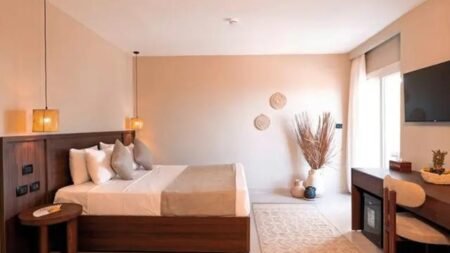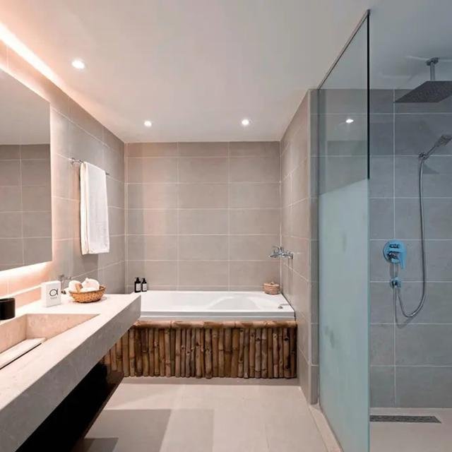 De kamers zijn stijlvol ingericht en voorzien van moderne gemakken. Sommige hebben uitzicht op zee of zelfs een jacuzzi in de kamer. Ook in de rest van het hotel zie je een mix van lichte kleuren en natuurlijke materialen, wat zorgt voor een luxe en ontspannen sfeer.