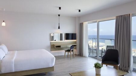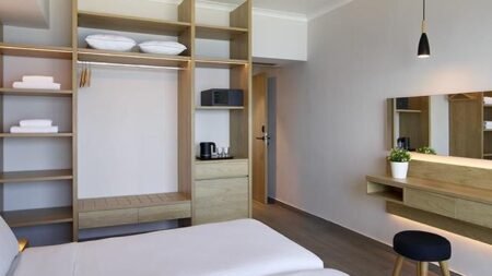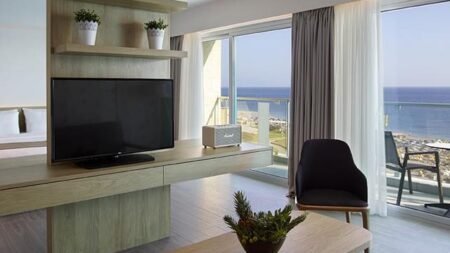 Hotel Aquarium View: de perfecte uitvalsbasis voor een onvergetelijke vakantie op Rhodos. Dit fijne hotel ligt in het noordelijkste deel van Rhodos, op slechts een paar minuten lopen van het centrum van Rhodos-Stad en het strand van Elli. De ligging van het hotel is werkelijk perfect: je bent zo bij de mooiste bezienswaardigheden van het eiland, maar ook bij het bruisende nachtleven en de gezellige restaurantjes. Het strand van Elli is een prachtig zandstrand met helderblauw water. Het is een ideale plek om te zonnebaden, te zwemmen of te watersporten. Het hotel ligt op slechts 20 meter van het strand, dus je kunt er zo heen lopen.