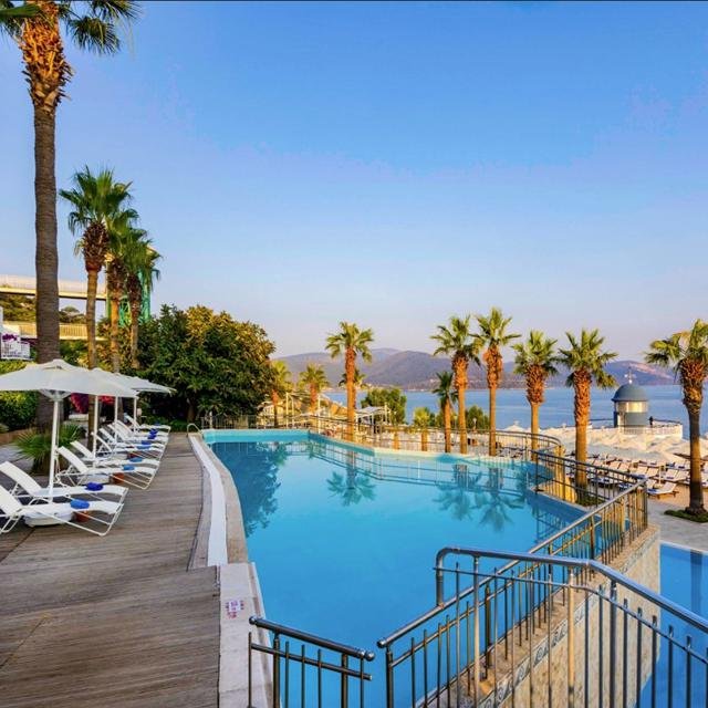 Het luxe vijfsterrenhotel Blue Dreams ligt aan een schitterende baai langs de Egeïsche kust waar je uitzicht hebt over de diepblauwe zee. Aan het strand en op de pier kun je op comfortabele ligbedjes genieten van de Turkse zon.
