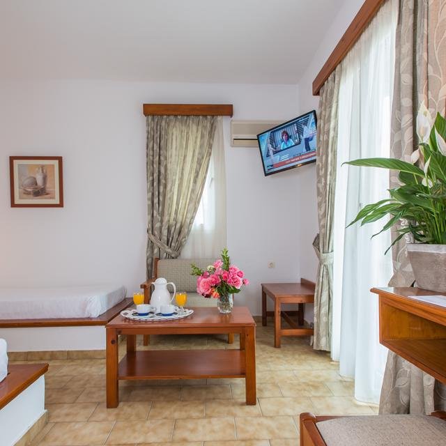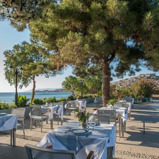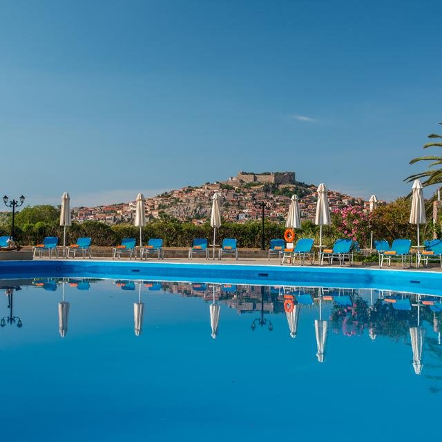 Delfinia ligt buiten het centrum van Molivos en beschikt over een schitterende tuin waar je heerlijk door heen kunt wandelen om te genieten van de mooie omgeving. Vanaf de ene kant van het complex heb je een fantastisch uitzicht op het plaatsje Molivos en aan de andere kant zie je de rotsen. Hou je van het strand? Delfinia beschikt over een lang en uitgerekt privéstrand, ideaal! Het complex zelf heeft een ruim zwembad met ligbedden en parasols. Word het je een beetje te warm? Bij de poolbar hebben ze een lekker frisdrankje voor je klaar staan. Ook de sportievelingen kunnen zich hier goed vermaken, wat dacht je van een potje basketballen, tennissen of volleyballen. In het restaurant, met uitzicht op zee, kun je heerlijk dineren. Alle gerechten worden met verse ingrediënten bereid.