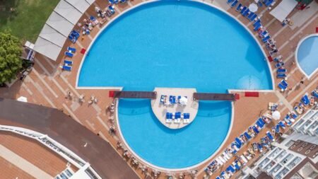Het witte hotel, met haar blauwe balkons ziet er schitterend uit tegen de helder blauwe lucht. Over het grote zwembad voor de deur lopen bruggetjes, naar het kleine eilandje in het midden, waar ook zonnebedjes staan. Ook is er een zwembad voor de twee glijbanen, die voor zowel jong als oud voor veel waterpret kunnen zorgen. Voor de allerkleinsten is er naast het kinderzwembadje ook een speeltuintje aanwezig.