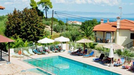 Het hotel heeft een authentieke uitstraling door het natuurstenen gebouw en heeft een eenvoudige inrichting. Vanaf het terras om het grote zwembad heen reikt het uitzicht tot aan zee, zodat je met een verfrissend drankje van de poolbar kunt genieten van dit mooie panorama. Voor eventuele kinderen is er een speeltuintje en apart kinderzwembad.