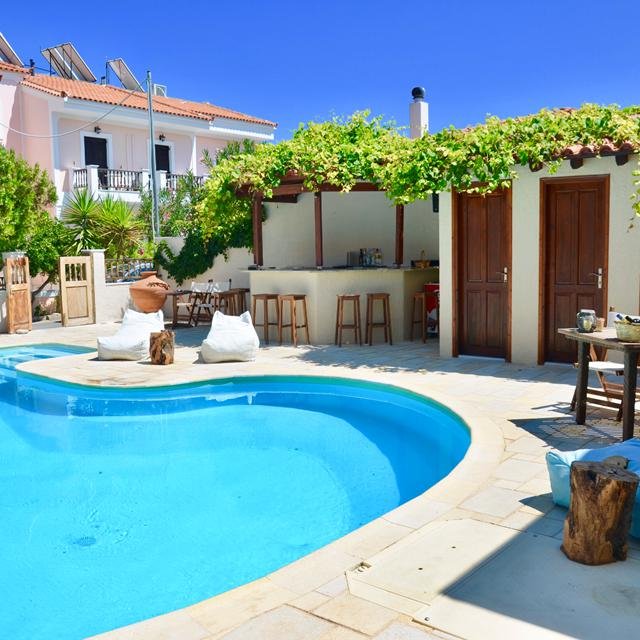 Het zonneterras ziet er uitnodigend uit met lekkere zonnebedjes en parasols. Dit kun je perfect afwisselen met pootje baden of baantjes trekken in het mooie zwembad bij het complex. Bij de poolbar kun je verschillende drankjes drinken, zoals ouzo, (lokale) biertjes en tropische cocktails.