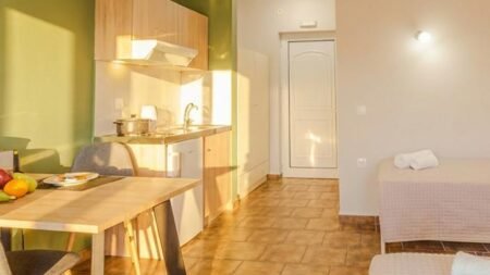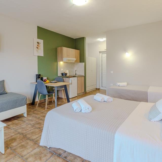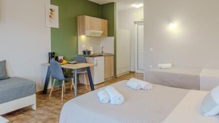 De appartementen zijn verzorgd ingericht en bieden alles wat je nodig hebt voor een ontspannen verblijf. Je hebt een eigen balkon of terras, waardoor je altijd een fijne plek hebt om nog even buiten te zitten na een zonnige dag. Door de centrale ligging vind je in de buurt veel taverna’s, winkels en fijne plekjes voor lunch of diner. Bij het zwembad vind je ligbedden om lekker te ontspannen. Wil je afkoelen, dan spring je even in het water of bestel je een koud drankje bij de bar.