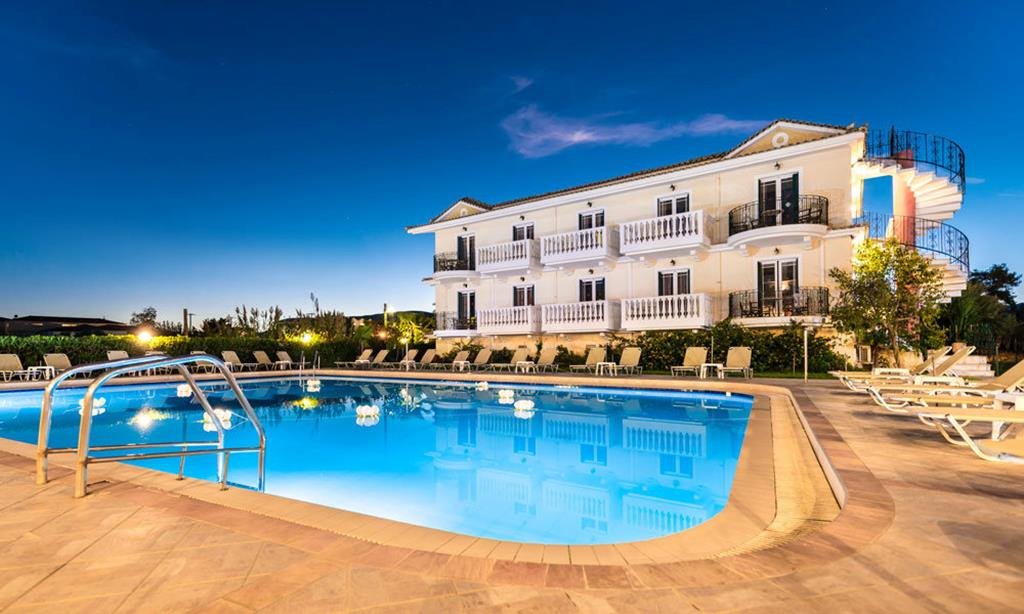 Dicht bij centrum van Laganas, Zwembad met ligbedden en palmen, Ontbijt met verse producten, Authentieke Griekse gastvrijheid, Paar stappen van het strand, Sfeervolle restaurants in de buurt & inclusief transfers.