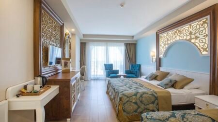 Welkom bij J'adore Deluxe Hotel & Spa, een aangenaam toevluchtsoord in de kleine toeristische badplaats Titreyengol. Dit comfortabele hotel ligt aan de prachtige kustlijn en bevindt zich op slechts 5 kilometer afstand van het levendige Manavgat. Met twee verfrissende buitenzwembaden en een spectaculair aquapark met leuke glijbanen is J'adore Deluxe Hotel & Spa de perfecte uitvalsbasis. In het hart van het resort vind je maar liefst zeven verschillende restaurants, waar je kunt genieten van voortreffelijke gerechten. Na een dag vol activiteiten kun je ontspannen in één van de vier gezellige bars en genieten van je favoriete drankje. Voor wie volledig wil ontspannen, beschikt het hotel over een uitgebreide spa met diverse behandelingen en massages om de dagelijkse stress te verlichten. Hier kun je echt tot rust komen tijdens je welverdiende vakantie! Geniet van de prachtige omgeving en alle gemakken die het J'adore Deluxe Hotel & Spa te bieden heeft voor een geslaagde vakantie.