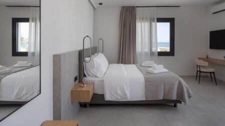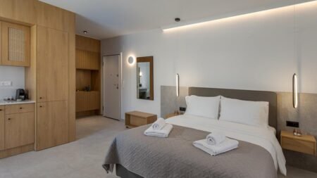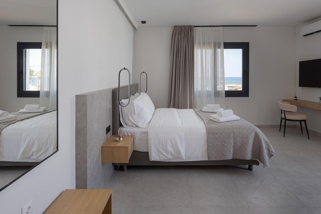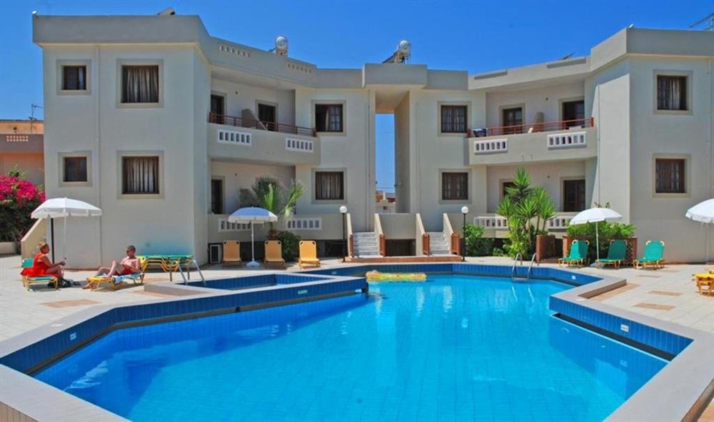Je wordt wakker met het zachte licht dat langs de leistenen paden valt. Vanuit je appartement stap je zo een rustige tuin in waar bougainvillea over de muren hangt. Bij het zwembad kies je een bedje uit en luister je hoe het water zacht tegen de rand tikt. De appartementen voelen comfortabel en praktisch, precies wat je nodig hebt voor lange dagen in de zon. Een klein terrasje is de ideale plek voor een ontbijt in de ochtendkoelte, terwijl je plannen maakt voor de dag. Het strand ligt op korte loopafstand en onderweg kom je langs bakkers, tavernes en kleine winkeltjes waar je de lokale sfeer meteen oppikt. In de buurt vind je een paar gezellige beachbars waar je na een zwembeurt even neerstrijkt. Of je blijft juist bij het complex en zoekt de rust op van de tuin. Zo vormt deze plek een fijne combinatie van eenvoud, gemak en het warme ritme van het Kretenzische leven.
