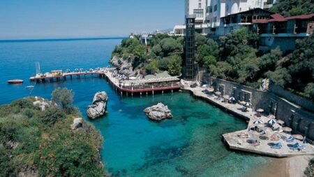 Direct naar: * Ligging () * Faciliteiten () * Restaurants & Bars () * Hotelkamers () * Sport & Ontspanning () * Kinderfaciliteiten () * Zwembaden & Strand () * Verzorging () Ligging: Korumar Deluxe * Gelegen op een heuvel * Direct aan zee met een eigen rotsplateau en opgespoten strandje, te bereiken via een lift * Op ca. 2 kilometer van Kusadasi * Bushalte voor het hotel Faciliteiten * 1 gebouw met 8 verdiepingen * 4 liften * 2 liften buiten, 1 naar het strand en 1 naar het zwembad * 272 kamers * 24-uursreceptie * Bagageruimte * Lobby * Tuin * Wifi in de openbare ruimtes * Kapsalon* * Winkeltjes en minimarkt* * Wasservice* * Doktersservice* * Privé parkeerterrein *Tegen betaling Restaurants & bars * 2 buffetrestaurants * 2 à-la-carterestaurants (vooraf reserveren) * 4 bars * Disco Hotelkamers * Standaardkamer landzicht (1-3 personen) * Ca. 23 m² * Telefoon* * Airconditioning * Televisie * Minibar * Kluisje * Koffie-/theezetfaciliteiten * Wifi * Douche * Toilet * Föhn * Balkon met zitje * Tegen een meerprijs boekbaar met zeezicht * De voordeelkamer kan qua faciliteiten en ligging afwijken van de standaardkamer landzicht *Tegen betaling * Grote standaardkamer landzicht (2-4 personen) * Ca. 27 m² * Bestaat uit 1 ruimte met extra bedden * Dezelfde faciliteiten als de standaardkamer landzicht * Tegen een meerprijs boekbaar met zeezicht * Executive kamer landzicht (1-4 personen) * Ca. 41-46 m² * Bestaat uit 1 ruimte met extra bedden * Dezelfde faciliteiten als de standaardkamer landzicht Sport & Ontspanning * Fitness * Aerobics * Boogschieten * Volleybal * Boccia * Darts * Tafelvoetbal* * Biljart* * Tafeltennis * Tennis (verlichting en materiaal tegen betaling) * Duikcenter* * Watersporten aan het strand* * Turks bad * Sauna * Binnenzwembad * Bubbelbad * Massages en behandelingen* * 6 dagen per week beperkt entertainment (vanaf 15-05) *Tegen betaling Kinderfaciliteiten * 1 kinderzwembad met glijbaantje * Miniclub 6 dagen per week van mei t/m oktober (4-12 jaar) * Minidisco 6 dagen per week * Speeltuintje Zwembaden & Strand * 1 buitenzwembad * 1 binnenzwembad * Zonneterras * Privéstrand en zonneplateaus * Ligbedden en parasols gratis (zwembad en strand) * Gratis badhanddoekenservice Verzorging Zomer : Korumar Deluxe * Verblijf o.b.v. All Inclusive: * Ontbijt in buffetvorm (07.00-10.00 uur) * Lunch in buffetvorm (12.30-14.00 uur) * Diner in buffetvorm (19.00-21.30 uur) * Snacks (11.00-16.00 uur) * Koffie/thee en koekjes (16.30-17.30 uur) * IJs (11.00-16.00 uur) * Nachtsnack (23.00-00.00 uur) * Geselecteerde lokale alcoholische en alcoholvrije drankjes van 10.00 tot 00.00 uur * Tegen betaling: import drankjes, verpakt ijs, diner in de à-la-carterestaurants (vooraf reserveren), verse vruchtensappen en roomservice