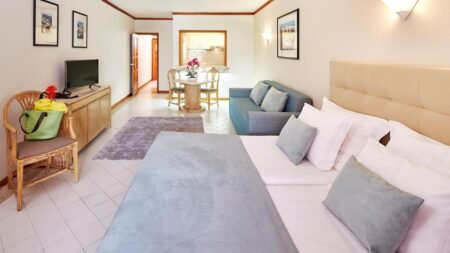 Wandel zo het strand op, Zonnen op het zonneterras, Plons in het zwembad, Koken in je eigen kitchenette, Struin door het oude stadscentrum, Uitslapen in comfortabele bedden & inclusief transfers.