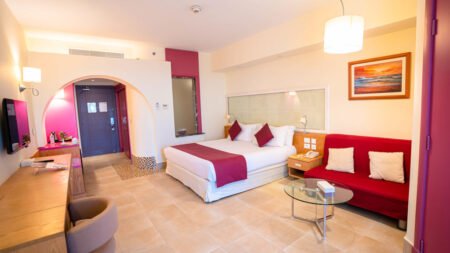 Aan de azuurblauwe kust van de Rode Zee ligt het Mercure Hurghada Hotel, een comfortabel viersterrenresort met een ontspannen sfeer en volop faciliteiten. Of je nu neerstrijkt op het privézandstrand, kiest voor een middagje snorkelen of liever een duik neemt in het zwembad, hier kan het allemaal. Het hotel ligt net buiten de drukte en biedt alles voor een zonnige vakantie vol sport, ontspanning en lekker eten. Er zijn meerdere restaurants en bars, een ruim zwembad, een duikcenter en volop activiteiten voor jong en oud. Dankzij de groene tuin, het brede strand en het heldere zeewater is dit een heerlijke plek om er even helemaal uit te zijn.