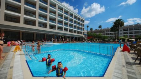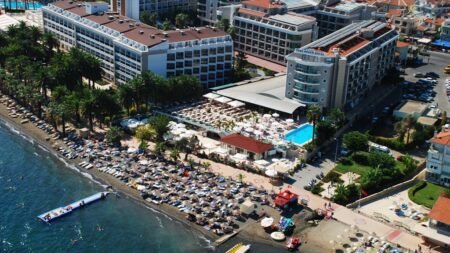 Direct naar: * Ligging () * Faciliteiten () * Restaurants & Bars () * Hotelkamers () * Sport & Ontspanning () * Kinderfaciliteiten () * Zwembaden & Strand () * Verzorging () Ligging: Pasa Beach * Aan het strand, gescheiden door een weg * Op ca. 2 kilometer van Marmaris * Bushalte op ca. 15 meter * Winkels, restaurants en bars in de directe omgeving Faciliteiten * 2 gebouwen met 5 verdiepingen * In beide gebouwen is een lift aanwezig * 427 kamers * 24-uursreceptie * Bagageruimte * Lobby * Wifi * Kapsalon* * Minimarkt* * Wasservice* * Doktersservice* * Openbare parkeerplaatsen *Tegen betaling Restaurants & bars * 1 buffetrestaurant * 1 à-la-carterestaurant (vooraf reserveren) * 4 bars Hotelkamers * Standaardkamer landzicht (1-3 personen) * Ca. 24 m² * Telefoon* * Airconditioning * Satelliettelevisie (sommige kanalen zijn tegen betaling) * Minibar* * Kluisje* * Koffie-/theezetfaciliteiten * Wifi* * Douche * Toilet * Föhn * Balkon met zitje * Tegen een meerprijs met zijzeezicht te boeken *Tegen betaling * Large kamer zijzeezicht (2-4 personen) * Ca. 30 m² * Bestaat uit 1 ruimte met extra bedden * Dezelfde faciliteiten als de standaardkamer * Badkamer met bad/douche, toilet en föhn Sport & Ontspanning * Fitness * Aerobics * Yoga * Darts * Biljart* * Tafeltennis * Watersporten aan het strand* * Turks bad * Sauna * Binnenzwembad * Massages en behandelingen* * 6 dagen per week beperkt entertainment *Tegen betaling Kinderfaciliteiten * 2 kinderzwembaden * Miniclub 6 dagen per week (4-12 jaar) * Minidisco 6 dagen per week * Speeltuintje * Babysitservice op aanvraag en tegen betaling Zwembaden & Strand * 1 buitenzwembad * 1 buitenzwembad met glijbaan (op vaste tijden geopend) * Zonneterras * Privéstrand * Ligbedden, matrasjes en parasols gratis (zwembad en strand) * Gratis badhanddoekenservice Verzorging Zomer : Pasa Beach * Verblijf o.b.v. All Inclusive: * Ontbijt in buffetvorm (07.30-10.00 uur) * Laat ontbijt in buffetvorm (10.00-11.00 uur) * Lunch in buffetvorm (12.30-14.00 uur) * Diner in buffetvorm (19.30-21.30 uur) * Snacks (12.00-16.00 uur) * Koffie/thee en koekjes (17.00-18.00 uur) * Nachtsnacks (23.00-00.00 uur) * Geselecteerde lokale alcoholische en alcoholvrije drankjes van 10.00 tot 00.00 uur * Tegen betaling: ijs, roomservice, import drankjes, verse vruchtensappen, (fris)drank in flessen, het à-la-carterestaurant (vooraf reserveren), de à la carte bar bij het strand en alle drankjes na 00.00 uur