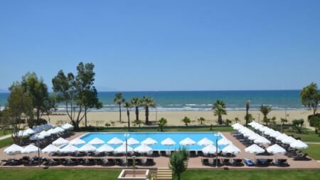Zomer Wanneer je tussen 01-04-2025 en 31-10-2025 in deze accommodatie verblijft, is onderstaande informatie van toepassing. * Ligging * Privéstrand * Zandstrand * Ligbedden met matrasjes gratis * Parasol gratis * Centrum van Kusadasi op circa 12 kilometer * Dichtstbijzijnde winkel op circa 12 kilometer * Dichtstbijzijnde restaurant op circa 12 meter * Dichtstbijzijnde bar op circa 12 kilometer * Bushalte op circa 500 meter * Taxistandplaats op circa 100 meter * Algemeen & faciliteiten * 9 gebouwen * Maximaal 6 verdiepingen * 264 kamers * Receptie * 24 uur per dag * Inchecken vanaf 14.00 uur * Uitchecken tot 12.00 uur * Lobby * 3 liften * Bagageruimte * Wifi in alle openbare ruimtes gratis * Winkel (minimarkt) * Wasservice tegen betaling * Doktersservice tegen betaling * Tuin * Privé parkeergelegenheid gratis * Restaurants & bars * Buffetrestaurant * 3 à-la-carterestaurants * Italiaans restaurant (vooraf reserveren) * Turks restaurant (vooraf reserveren) * Visrestaurant (vooraf reserveren) * Snackbar * Meerdere drinkgelegenheden * Beachbar * Lobbybar * Poolbar * Activiteiten & ontspanning * Aerobics gratis, tegen betaling * Basketbal gratis * Beachvolleybal gratis * Biljart tegen betaling * Boccia gratis * Boogschieten gratis * Darts gratis * Fitness gratis * Midgetgolf gratis * Tafeltennis gratis * Voetbal gratis * Volleybal gratis * Spafaciliteiten * Sauna gratis * Hamam gratis * Massages tegen betaling * Schoonheidsbehandelingen tegen betaling * Gameroom * Animatie voor volwassenen * 7 keer per week * Shows * 7 keer per week * Livemuziek * 6 keer per week * Zwembaden * 3 buitenzwembaden * Relaxbad * Eén van deze zwembaden heeft 3 glijbanen * Buitenzwembad voor kinderen * Binnenzwembad * Bubbelbad binnen * Zonneterras * Ligbedden met matrasjes gratis * Parasol gratis * Kinderfaciliteiten * Mini club (4-12 jaar) * 7 keer per week * Minidisco * Buitenspeeltuin * Babybedje op aanvraag via ons contact center gratis * Babysitservice tegen betaling * ter plaatse op aanvraag * Verzorging * All Inclusive * Ontbijt in buffetvorm (07.00-10.00 uur) * Laat ontbijt in buffetvorm (10.00-10.30 uur) * Lunch in buffetvorm (12.30-14.30 uur) * Diner in buffetvorm (19.30-21.30 uur) * Dineren in enkele à-la-carterestaurants 1 keer per verblijf bij een verblijf van minimaal 7 dagen * Snacks (12.30-17.00 uur) * Koffie, thee & koekjes (17.00-18.00 uur) * IJs (16.00-17.00 uur) * Middernachtsnack (00.00-01.00 uur) * Selectie lokale (non-)alcoholische drankjes (10.00-00.00 uur) * Tegen betaling: dineren in één van de à-la-carterestaurants, import drankjes, verse vruchtensappen en roomserviceHotelkamers * 2-persoonskamer Standaard Club DZC * 2-persoonskamer Standaard Landzicht DZL * 2-persoonskamer Standaard Zeezicht DZM * Familiekamer Standaard FZ