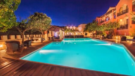 Skopelos-stad is zo te bereiken, Veel keuze bij het ontbijtbuffet, Goed vertoeven bij het zwembad, Of neem een drankje aan de bar, Het personeel staat voor je klaar, Onafhankelijk duurzaamheidslabel & inclusief transfers.