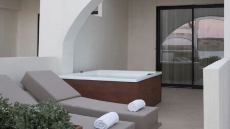 Geniet van een heerlijk verblijf in Agia Pelagia, waar de kustlijn je zal verbazen. Ontdek de prachtige stranden, waar het kristalheldere blauwe water je uitnodigt voor verfrissende duiken of ontspanning op het zachte zand. Wandel door de gezellige straatjes en dompel jezelf onder in de Kretenzische cultuur. Laat je verwennen in traditionele tavernes met heerlijke Griekse lekkernijen. Vergeet niet om een lokale winkel binnen te stappen voor een uniek souvenir. Welkom in de wereld van Salt Suites, waar splinternieuwe suites je een ongekende sensatie van weelde beloven. Op jouw privéterras omringd door een overkapping geniet je van een oase van rust, terwijl je aan de voorkant van de suites kunt zonnebaden op comfortabele ligstoelen. Verwen jezelf met een glas wijn terwijl je languit ontspant in je eigen bubbelbad met uitzicht op de zee. Boek nu je vakantie in het kleinschalige Salt Suites, waar luxe en comfort samensmelten tot een onvergetelijke ervaring.