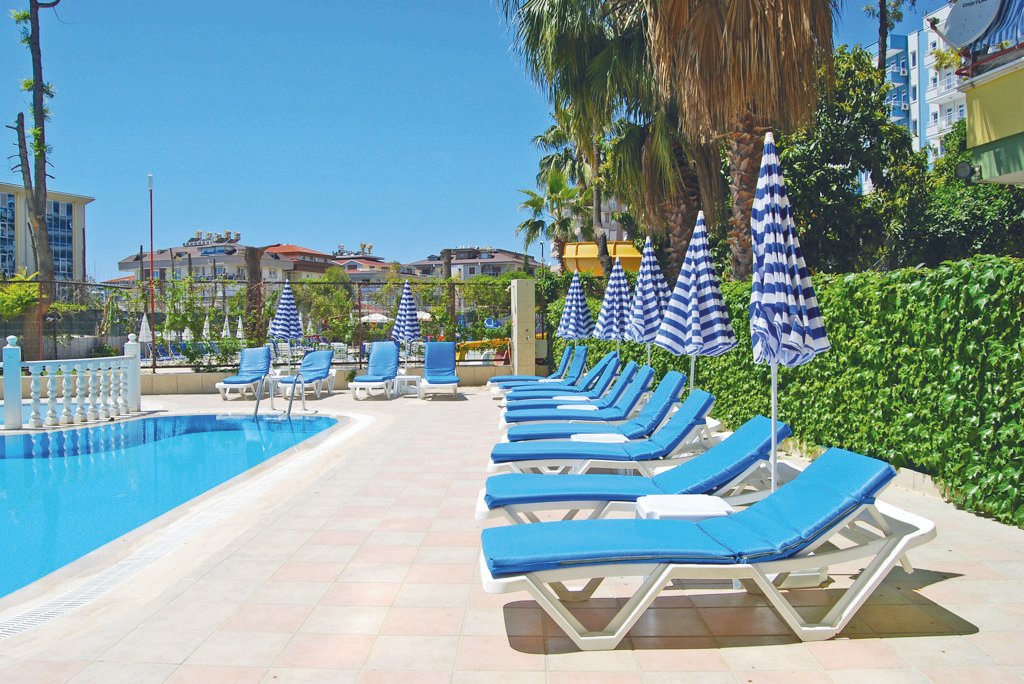 Zomer Wanneer je tussen 01-04-2025 en 31-10-2025 in deze accommodatie verblijft, is onderstaande informatie van toepassing. * Ligging * Openbaar strand Kleopatra Beach op circa 1,7 kilometer * Ligbedden met matrasjes tegen betaling * Parasol tegen betaling * Dichtstbijzijnde winkel op circa 10 meter * Dichtstbijzijnde restaurant op circa 10 meter * Dichtstbijzijnde bar op circa 10 meter * Alanya op circa 1 kilometer * Shuttleservice naar het strand * Bushalte op circa 100 meter * Algemeen & faciliteiten * 1 gebouw * Maximaal 5 verdiepingen * 50 kamers * Receptie * 24 uur per dag * Lobby * Lift * Wifi in alle openbare ruimtes * Internetruimte tegen betaling * Winkel (minimarkt) * Wasservice tegen betaling * Doktersservice tegen betaling * Tuin * Openbare parkeergelegenheid * Restaurants & bars * Buffetrestaurant * À-la-carterestaurant * 3 drinkgelegenheden * Bar * Beachbar * Poolbar * Activiteiten & ontspanning * Beachvolleybal * Biljart tegen betaling * Darts * Fietsverhuur tegen betaling * Midgetgolf * Tafeltennis * Gameroom * Animatie * 2 keer per week * Shows * Eén keer per week * Livemuziek * Eén keer per week * Zwembaden * Buitenzwembad * Gesloten in het winterseizoen * Buitenzwembad voor kinderen * Gesloten in het winterseizoen * Zonneterras * Ligbedden met matrasjes * Parasol * Badhanddoekenservice gratis met borg * Kinderfaciliteiten * Buitenspeeltuin * Babybedje * Verzorging * Logies * Logies & Ontbijt * Ontbijt in buffetvormHotelkamers * Studio Standaard SZ * Oppervlakte circa 22 m² * Airconditioning tegen betaling * Kluisje tegen betaling * Satelliettelevisie * Telefoon tegen betaling * Kitchenette * 2-pits kooktoestel * Koffie- en theefaciliteiten * Koelkast * Badkamer met bad of douche, toilet en föhn * Wifi * Balkon (zitje) * 2-kamerappartement 2A * Oppervlakte circa 42 m² * Woon-/slaapkamer met meerdere slaapplaatsen: slaapbank voor twee personen * Eén slaapkamer * Airconditioning tegen betaling * Kluisje tegen betaling * Satelliettelevisie * Telefoon tegen betaling * Kitchenette * 2-pits kooktoestel * Koffie- en theefaciliteiten * Koelkast * Badkamer met bad of douche, toilet en föhn * Wifi gratis * Balkon of terras (zitje)