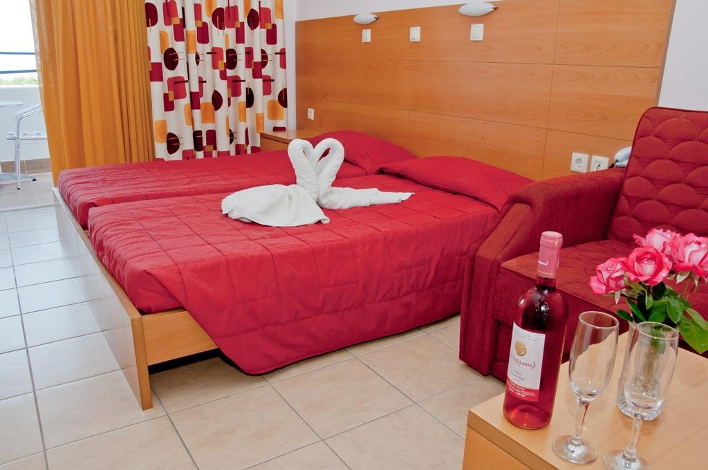 Bij aankomst voel je je meteen welkom op deze prachtige locatie. Je verblijft in een groene omgeving, met bergen in de verte en een goudgeel zandstrand op korte afstand. De Egeïsche Zee schittert in de zon en zorgt samen met het zwembad voor de nodige verkoeling. Een drankje uit de poolbar maakt het plaatje compleet. In het restaurant proef je van heerlijke maaltijden, geserveerd met de bekende Griekse gastvrijheid. Voor wie graag actief is, biedt de omgeving volop mogelijkheden. Verken de streek te voet of per fiets, of probeer een van de watersporten op zee. En wanneer de zon ondergaat, geniet je van een adembenemend uitzicht vanuit je kamer.