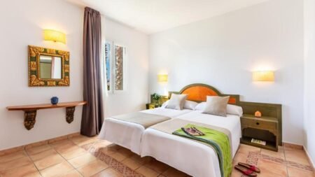 Stel je voor je wordt wakker in je comfortabele kamer, klaar om de dag te beginnen. Eerst plons je in het zwembad, omringd door een zonneterras waar je heerlijk ontspant. Daarna wandel je naar het strand, waar het zachte zand en het heldere water je uitnodigen voor een verfrissende duik. Deze accommodatie biedt alles wat je nodig hebt voor een perfecte vakantie. Geniet van een smakelijke maaltijd in het restaurant. Zijn de kids mee? Die genieten van het kinderzwembad en de speeltuin. Ontdek de charme van het eiland en maak een uitstapje naar de oude stad, op slechts 2 kilometer afstand. Het eiland staat bekend om zijn natuurlijke schoonheid en rijke geschiedenis. Dit hotel is de ideale uitvalsbasis om dit alles te verkennen. Hier begint je vakantie vol plezier en ontspanning in het zonnige Spanje.