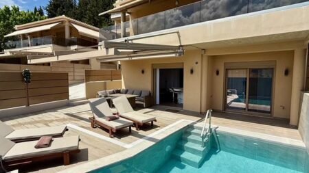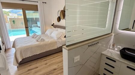 De villa is van hoge kwaliteit en biedt volop comfort. Je hebt een moderne kamer met je eigen balkon of terras – perfect om lekker buiten te zitten. Neem een frisse duik in je privézwembad en haal ’s ochtends een broodje bij de bakker om de hoek. Alles wat je nodig hebt, van een supermarkt tot gezellige tavernes, ligt op loopafstand. Lefkada Paradise Resort is de ideale uitvalsbasis voor een relaxte vakantie op dit zonnige eiland.
