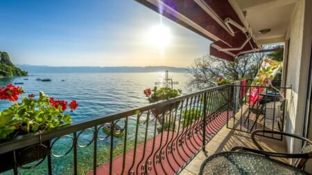Op slag verliefd op deze plek, Direct aan het meer van Ohrid, Optionele wijnproeverij, Modern, sfeervol ingerichte kamer, Uniek gelegen, rust en uitzicht, Uitzicht op het dorpje Trpejca & inclusief transfers.