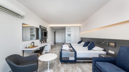 Dit hotel zet je meteen in vakantiemodus. Je loopt de deur uit, voelt de warmte op je huid en staat via de tunnel zo met je voeten in het zand. Dit hotel maakt je zonvakantie lekker simpel eten en drinken wanneer jij daar zin in hebt. Overdag chill je bij het zwembad, ja, met glijbaan bestel je iets fris aan de strandbar en pak je tussendoor een sessie in de fitness. Toe aan stilte? Duik de spa in, warm op in de sauna en kom terug met dat 'alles komt goed' gevoel. En als je 's avonds nog energie over hebt, schuif je aan of pik je entertainment mee. Bij dit hotel draait het om rust, zon en strand dat altijd dichtbij is.